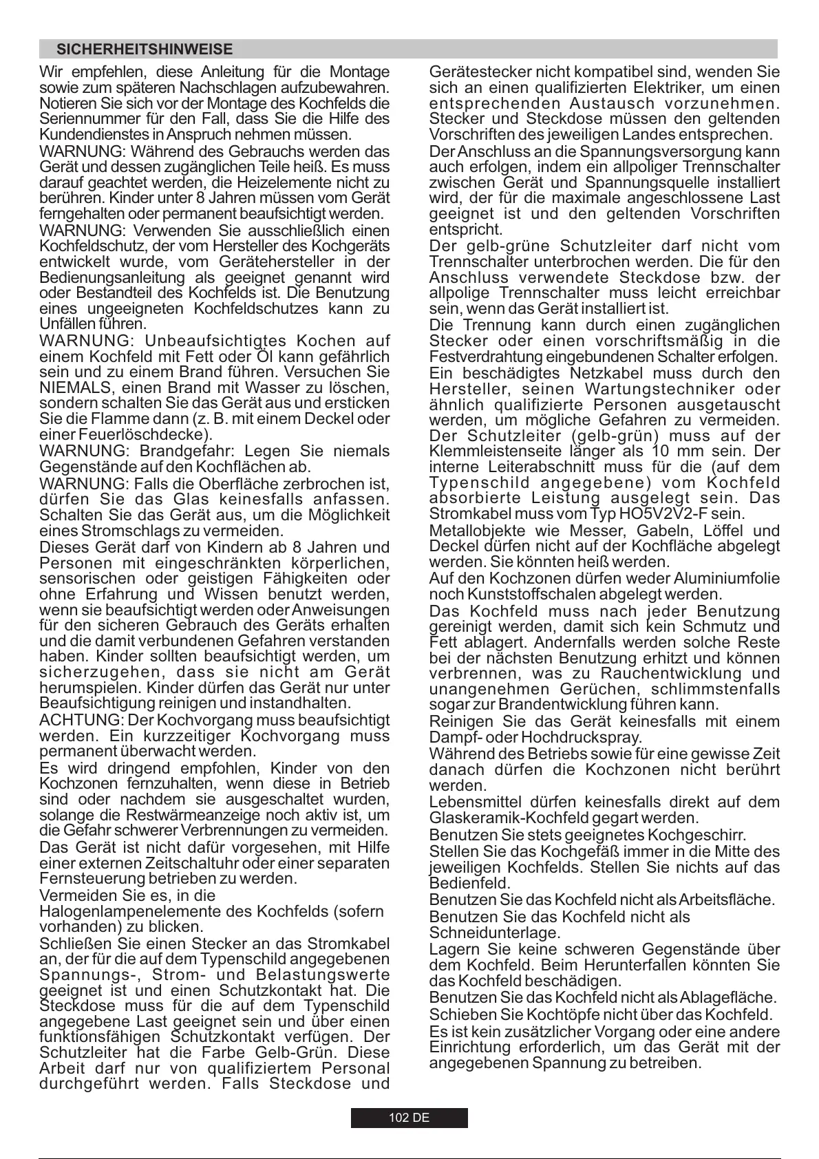 WARNUNG: Unbeaufsichtigtes Kochen auf
