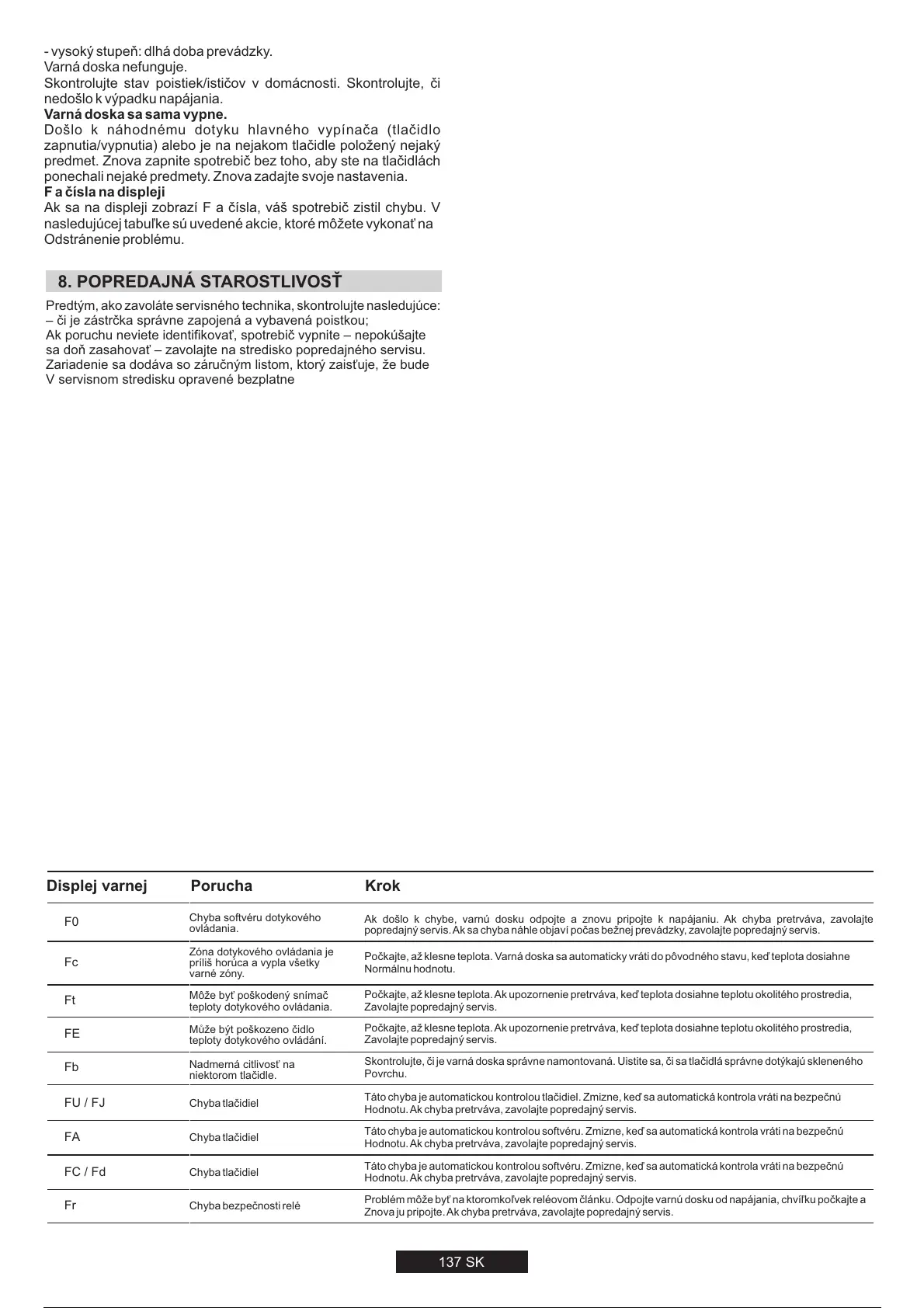 Ak došlo k chybe, varnú dosku odpojte a znovu pripojte k napájaniu. Ak chyba pretrváva, zavolajte