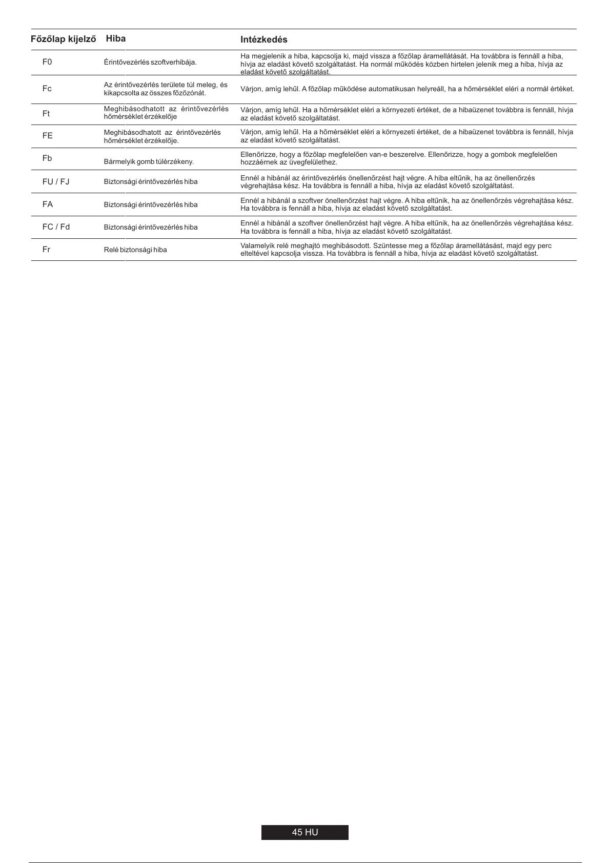 Ha megjelenik a hiba, kapcsolja ki, majd vissza a főzőlap áramellátását. Ha továbbra is fennáll a hiba,