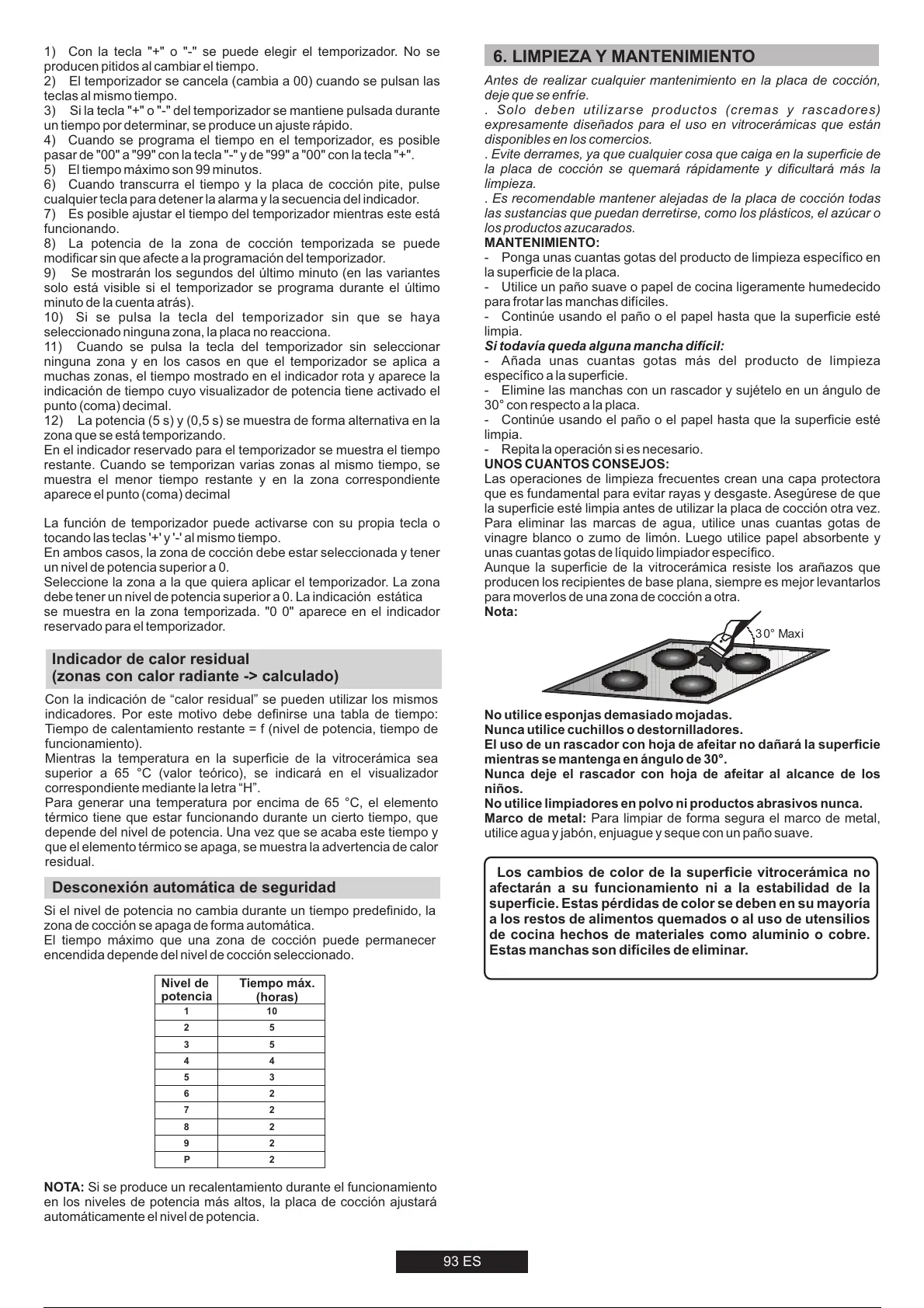 El tiempo máximo que una zona de cocción puede permanecer