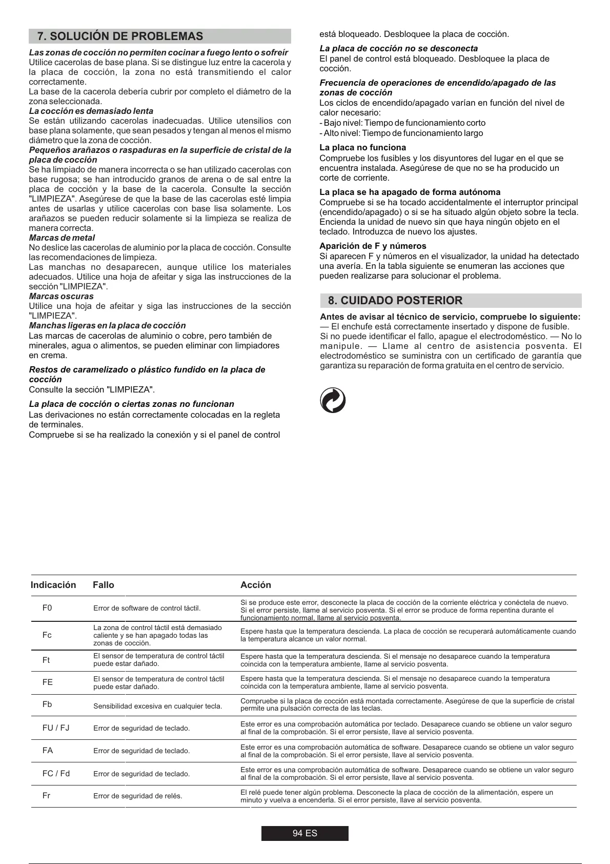 Si se produce este error, desconecte la placa de cocción de la corriente eléctrica y conéctela de nuevo.