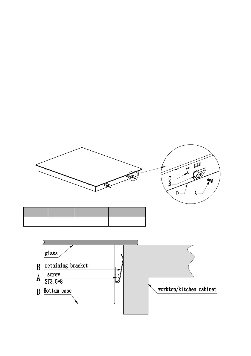 Fix the hob on the work surface by screw 4 brackets on the bottom case of hob