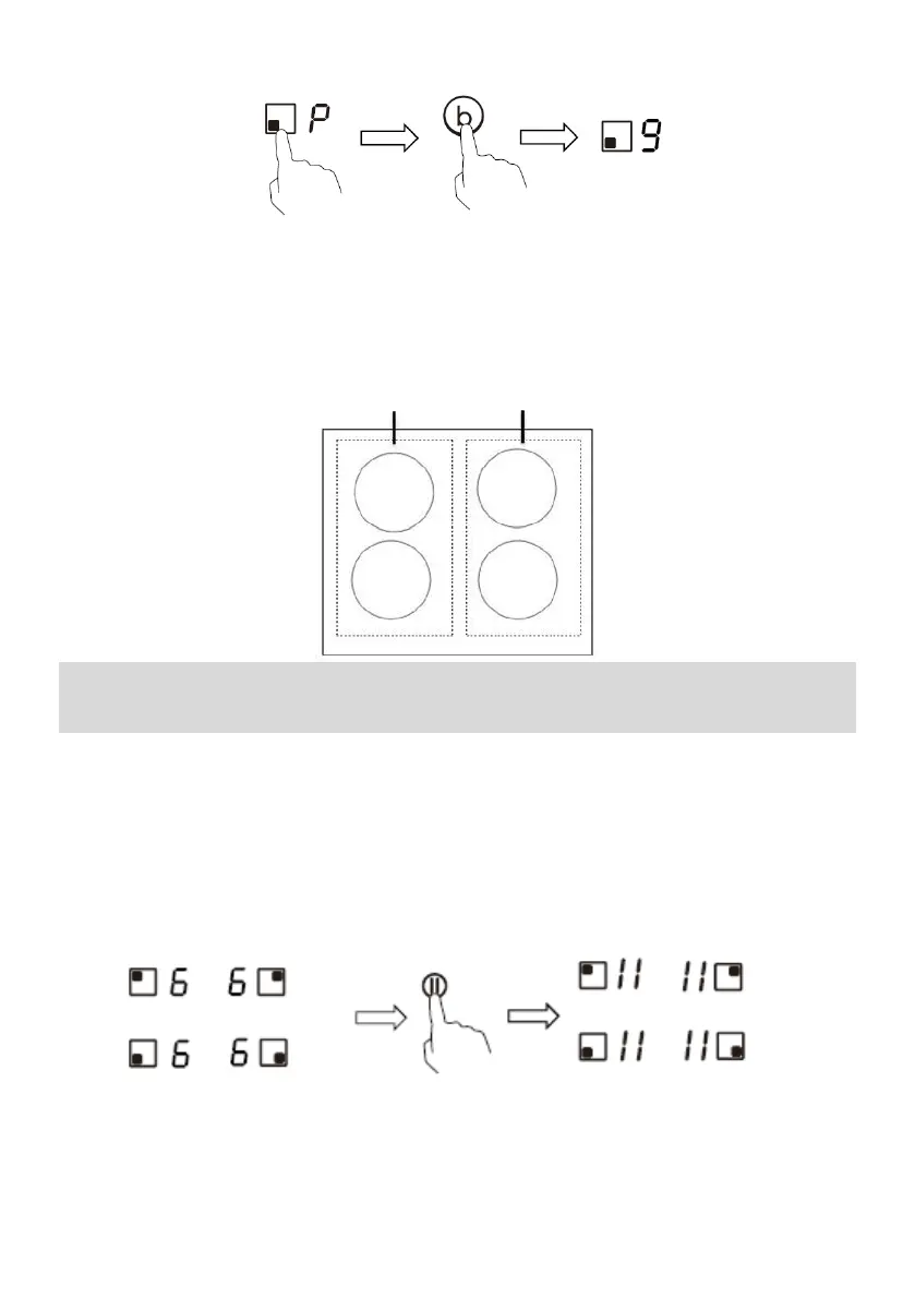 2. Érintse meg a LEÁLLÍTÁS+INDÍTÁS gombot, ekkor a főzőzóna kijelzőjén „ll” jelenik