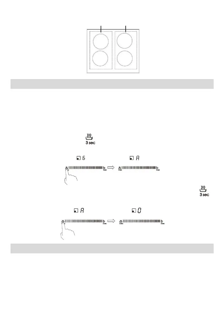 gumb pridržite za 3 sekunde; na indikatorju kuhališča se prikaže »A«.