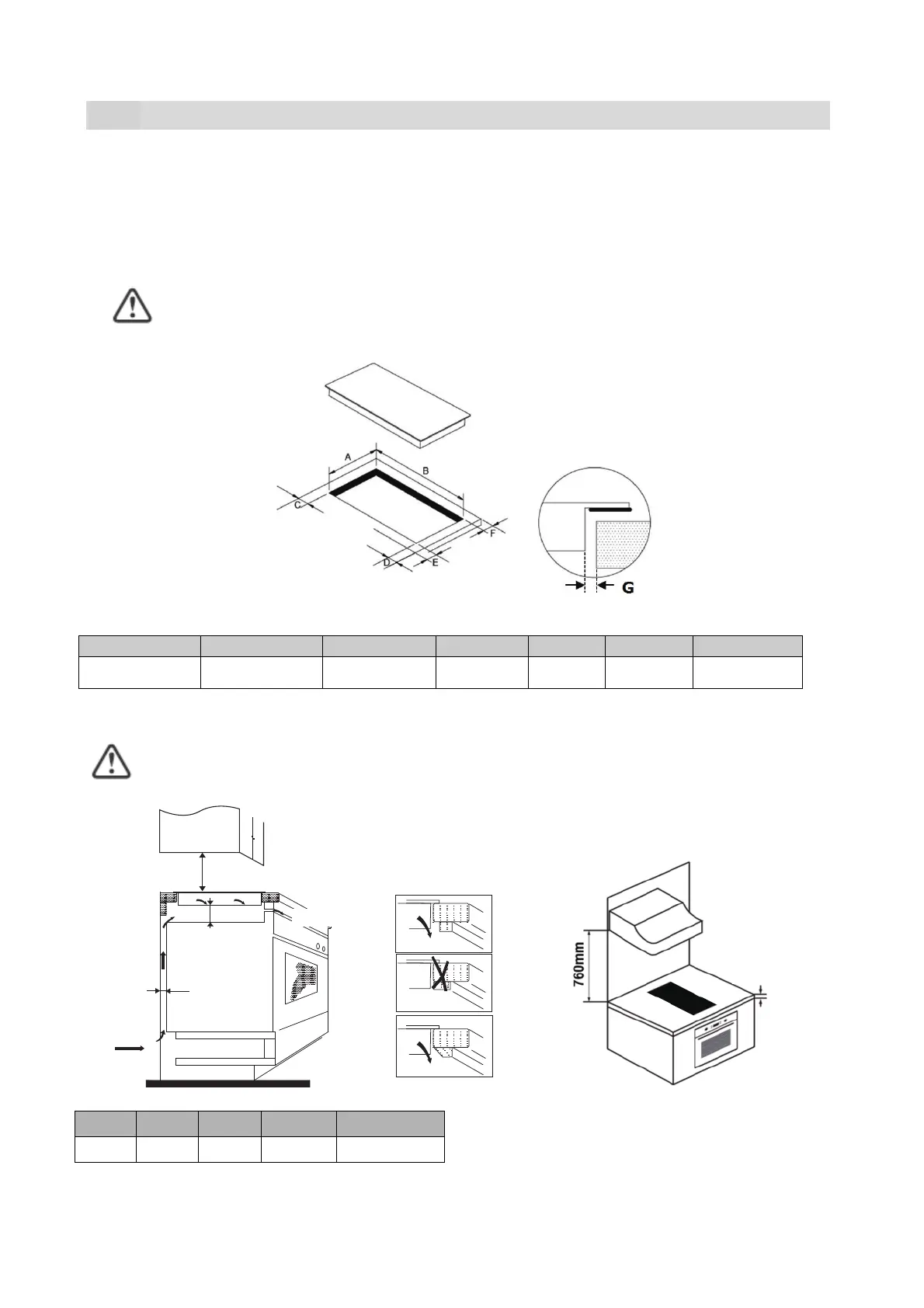 Note: The safety distance between the hotplate and the cupboard above the hotplate should be at least 760mm.
