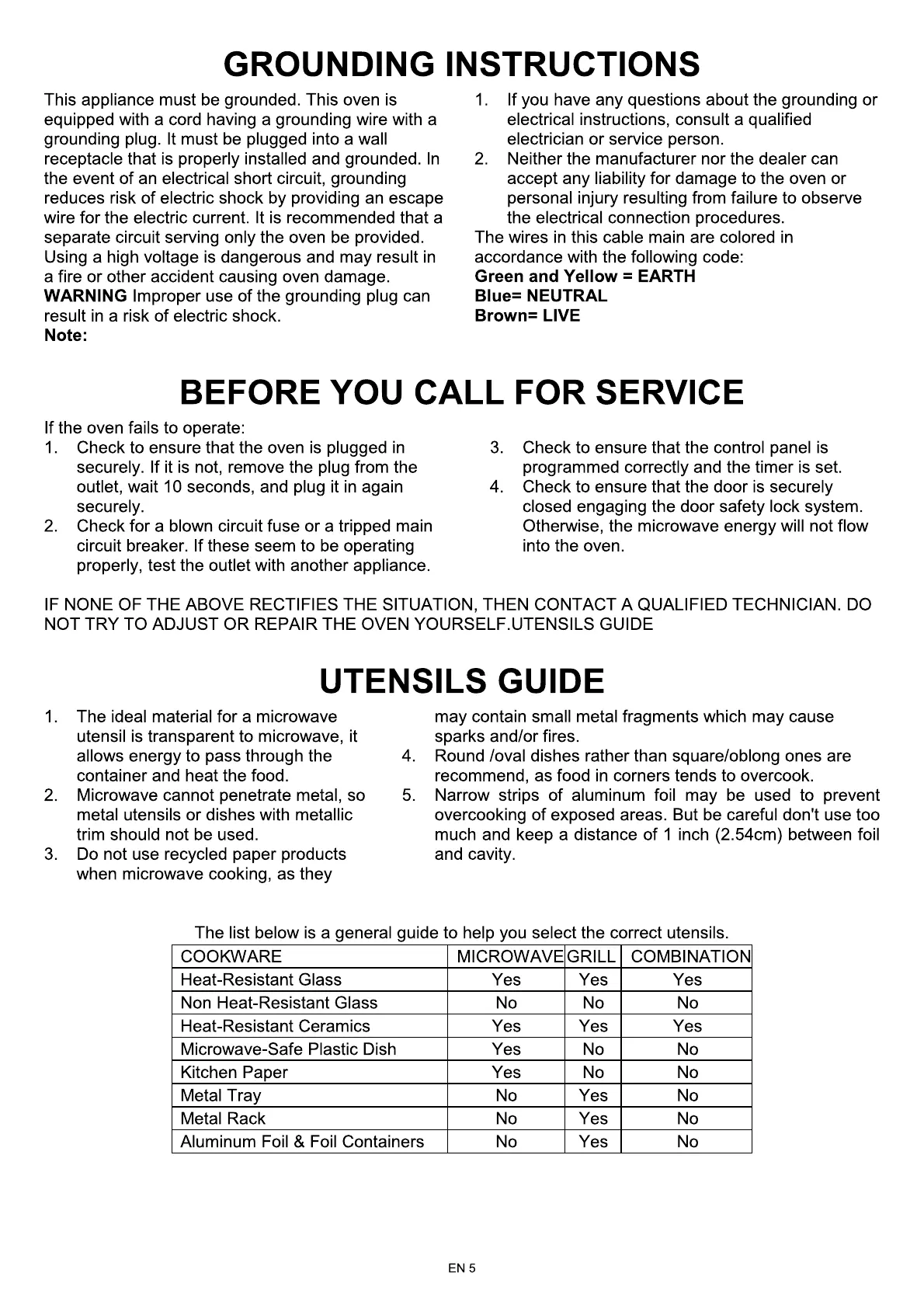 Candy CMG 2071DS - Grounding Instructions; Before You Call for Service; Utensils Guide