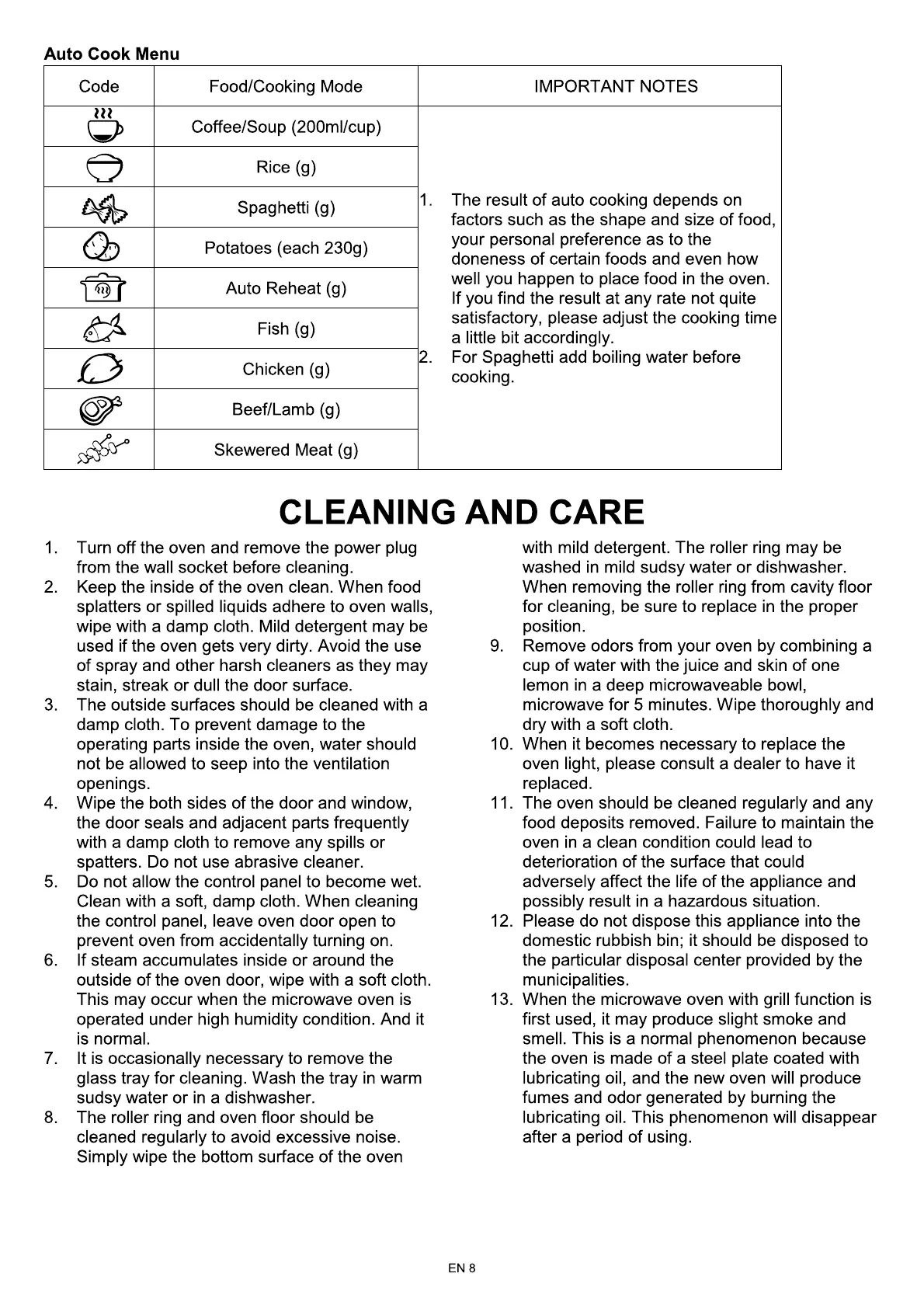 Candy CMG 2071DS - Auto Cook Menu; Cleaning and Care