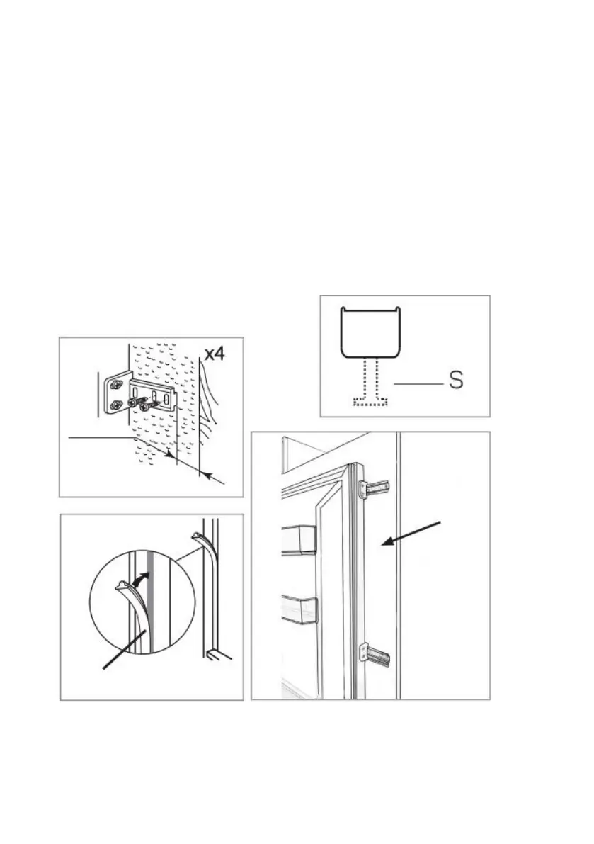 • Ujistěte se, že mezi stranou bez závěsů a stěnou skříně je mezera 3 až 4 mm.