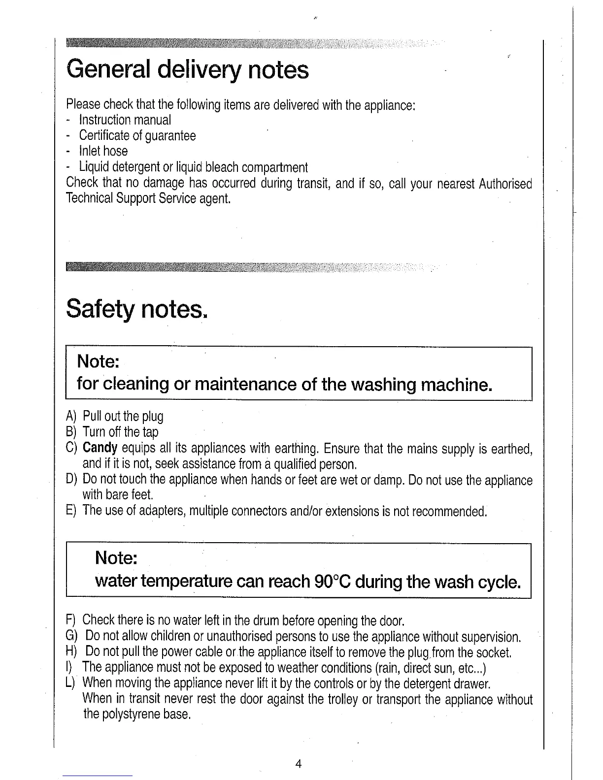 Candy CNA 166 - General Delivery and Safety; General Delivery Notes; Safety Notes