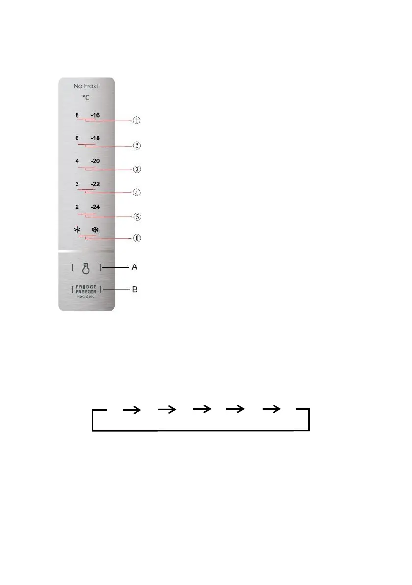 Appuyez sur le bouton de commutation réfrigérateur/congélateur (B) pendant 3 s, les icônes de