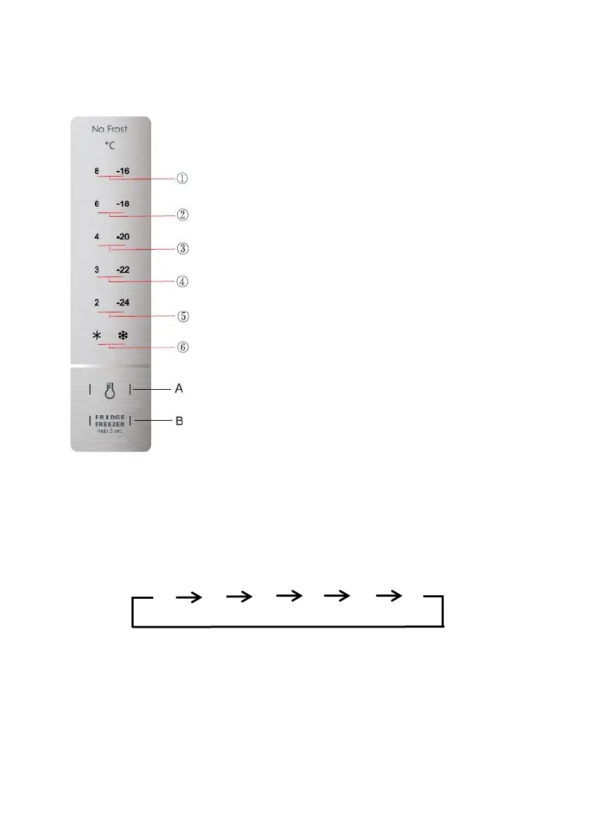 Druk 3 seconden op de schakelknop koelkast/vriezer (B). De bijbehorende temperatuurpictogrammen