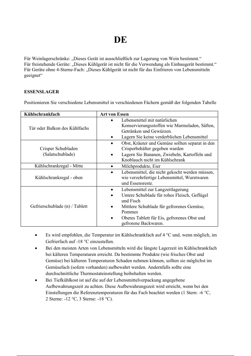 • Es wird empfohlen, die Temperatur im Kühlschrankfach auf 4 °C und, wenn möglich, im