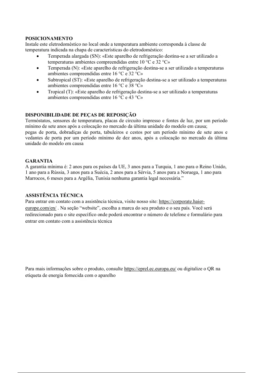 • Temperada (N): «Este aparelho de refrigeração destina-se a ser utilizado a temperaturas