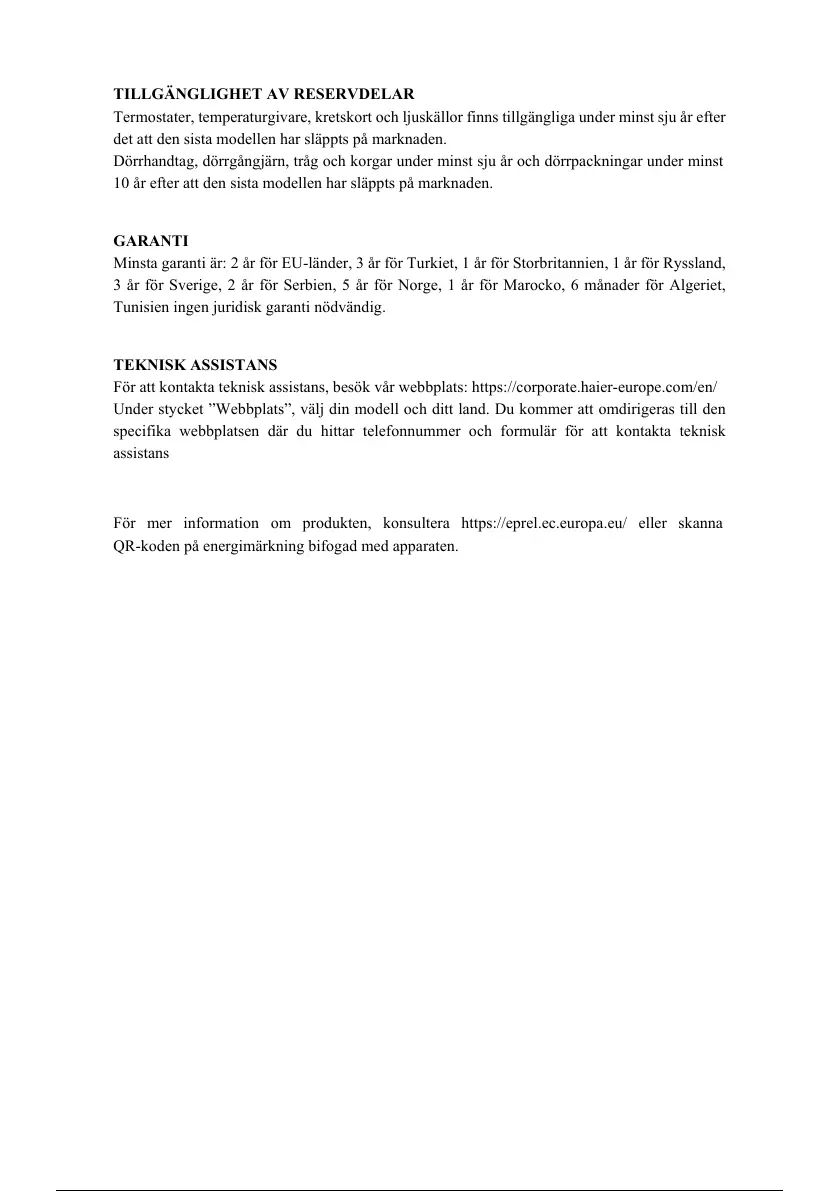 För att kontakta teknisk assistans, besök vår webbplats: https://corporate.haier-europe.com/en/
