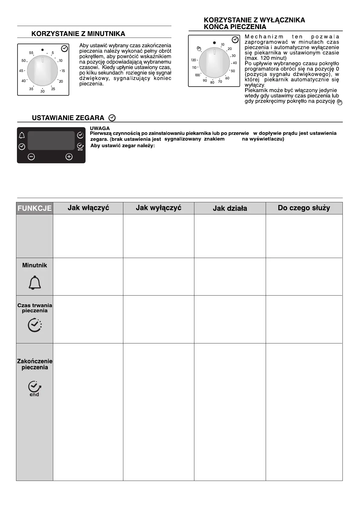 UWAGA: Piekarnik działa tylko jeżeli zegar jest ustawiony.