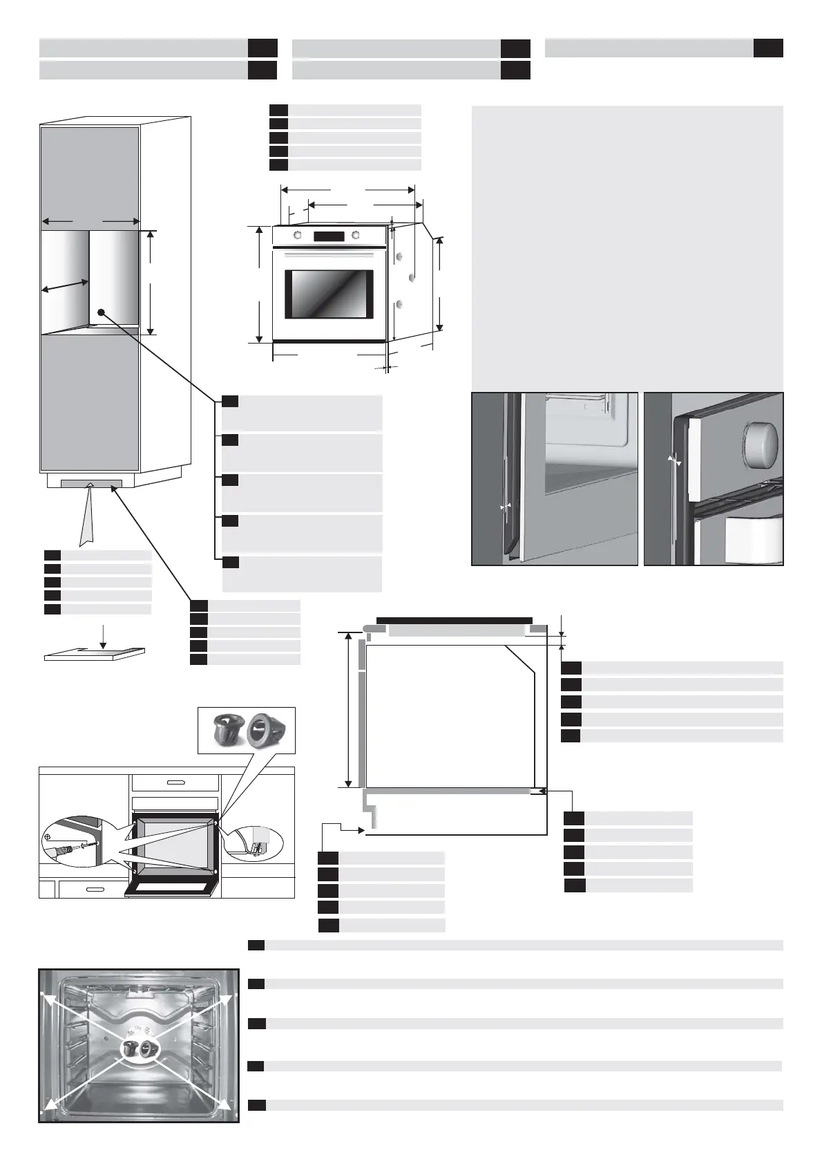 Inside the oven there is a bag with four fixing screws. Fixing: When the oven door is open, holes are accessible, they are located on each side. Use the screws