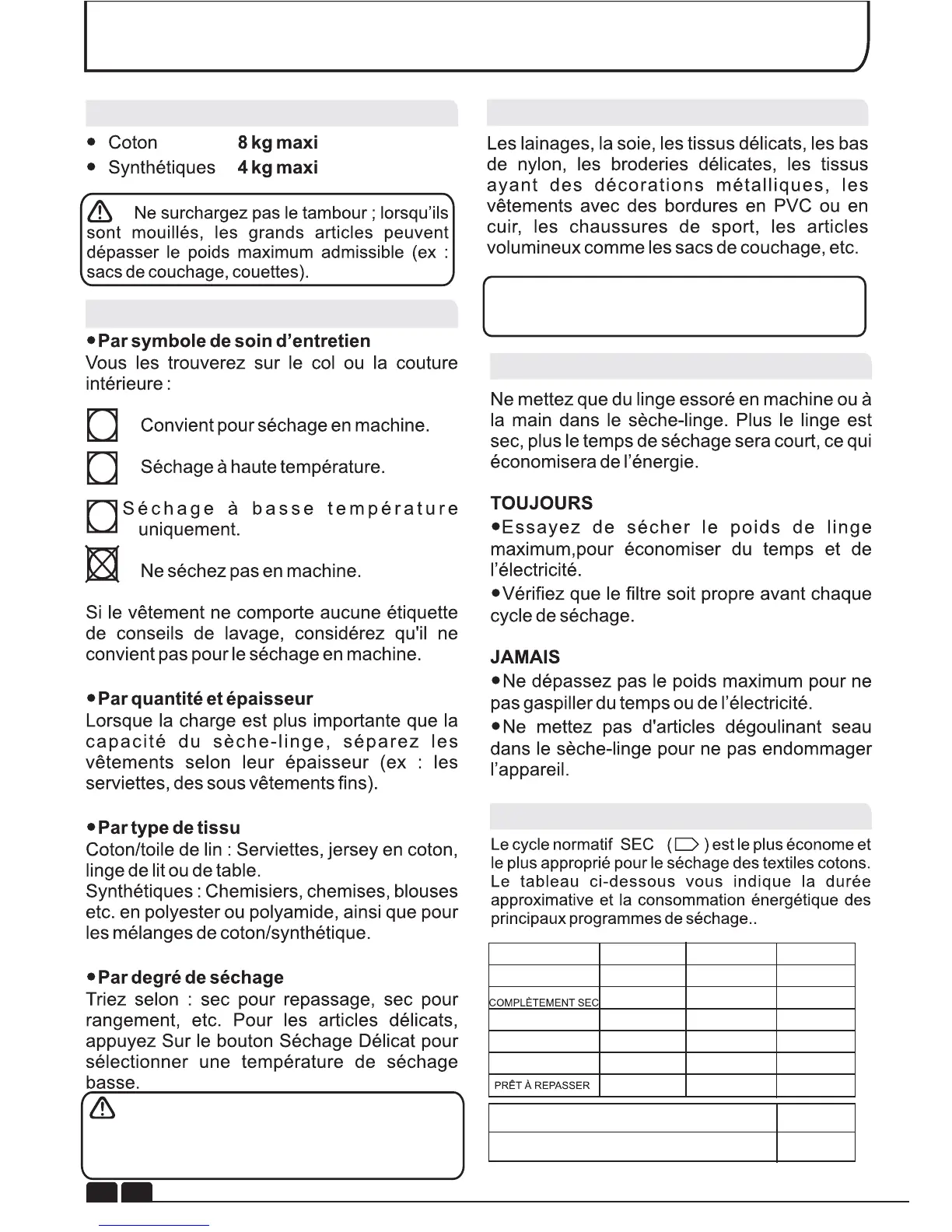 IMPORTANT : Ne séchez pas les articles