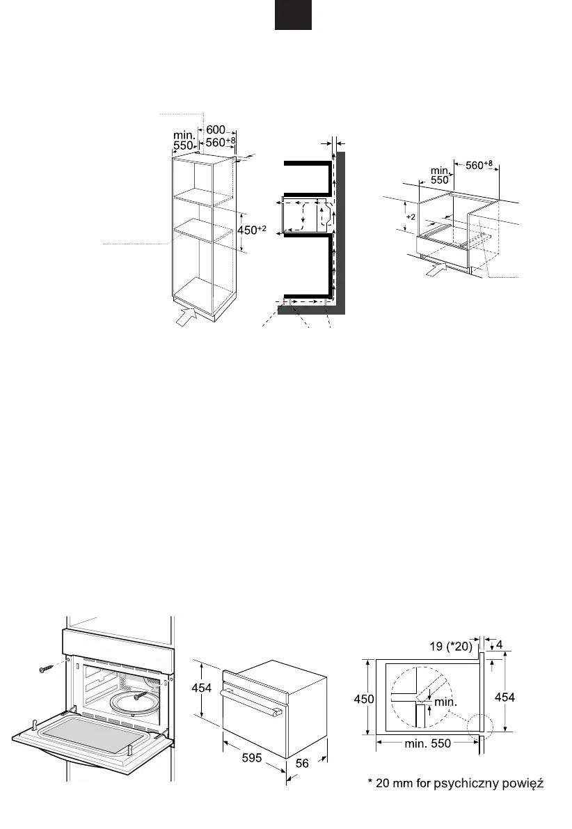 1. Wsunąć delikatnie kuchenkę do wnęki zabudowy, sprawdzić czy umieszczona jest centralnie we