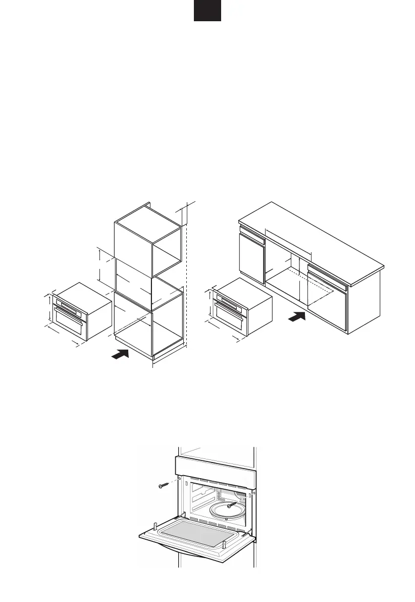 1. Осторожно вставьте микроволновую печь в нишу. Проверьте центровку.
