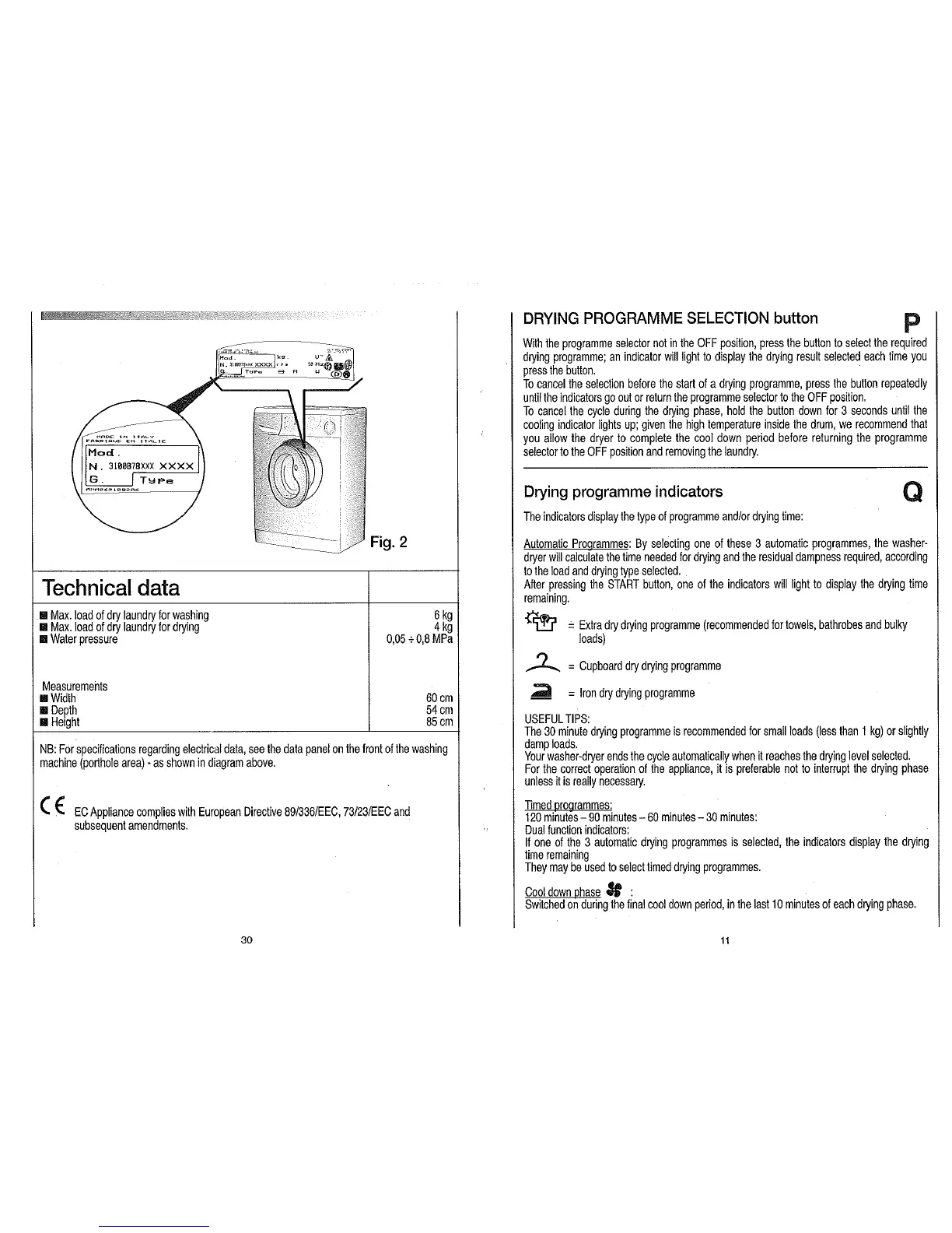 Candy Washer dryer - Drying Programme Selection; Drying Programme Selection Button; Drying Programme Indicators