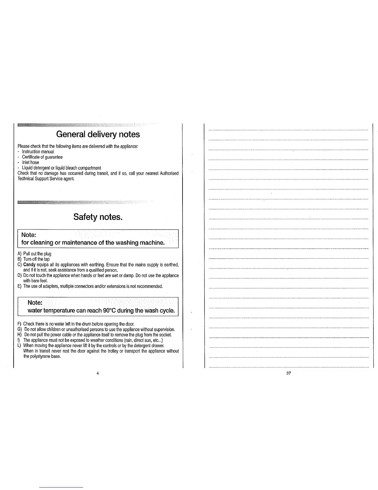 Candy Washer dryer - General Delivery Notes; Safety Notes