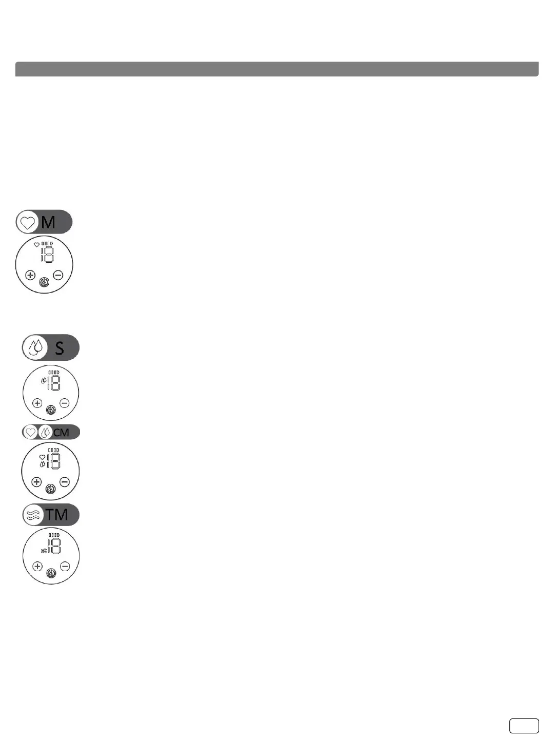 modus combineert massage (stimulatie) met knijpen en heeft 10 standen. Met behulp van de knoppen +