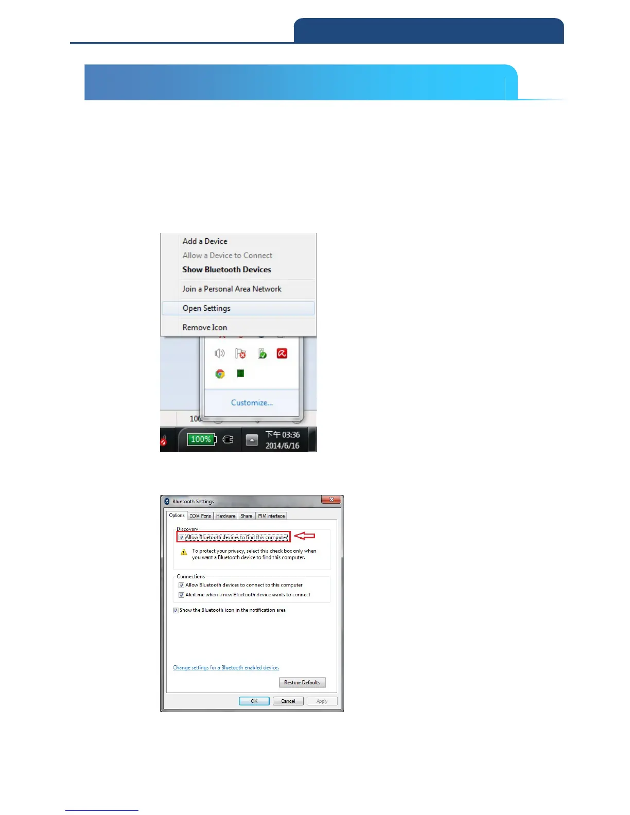 In this page, click ”Allow Bluetooth devices to find this computer” to let