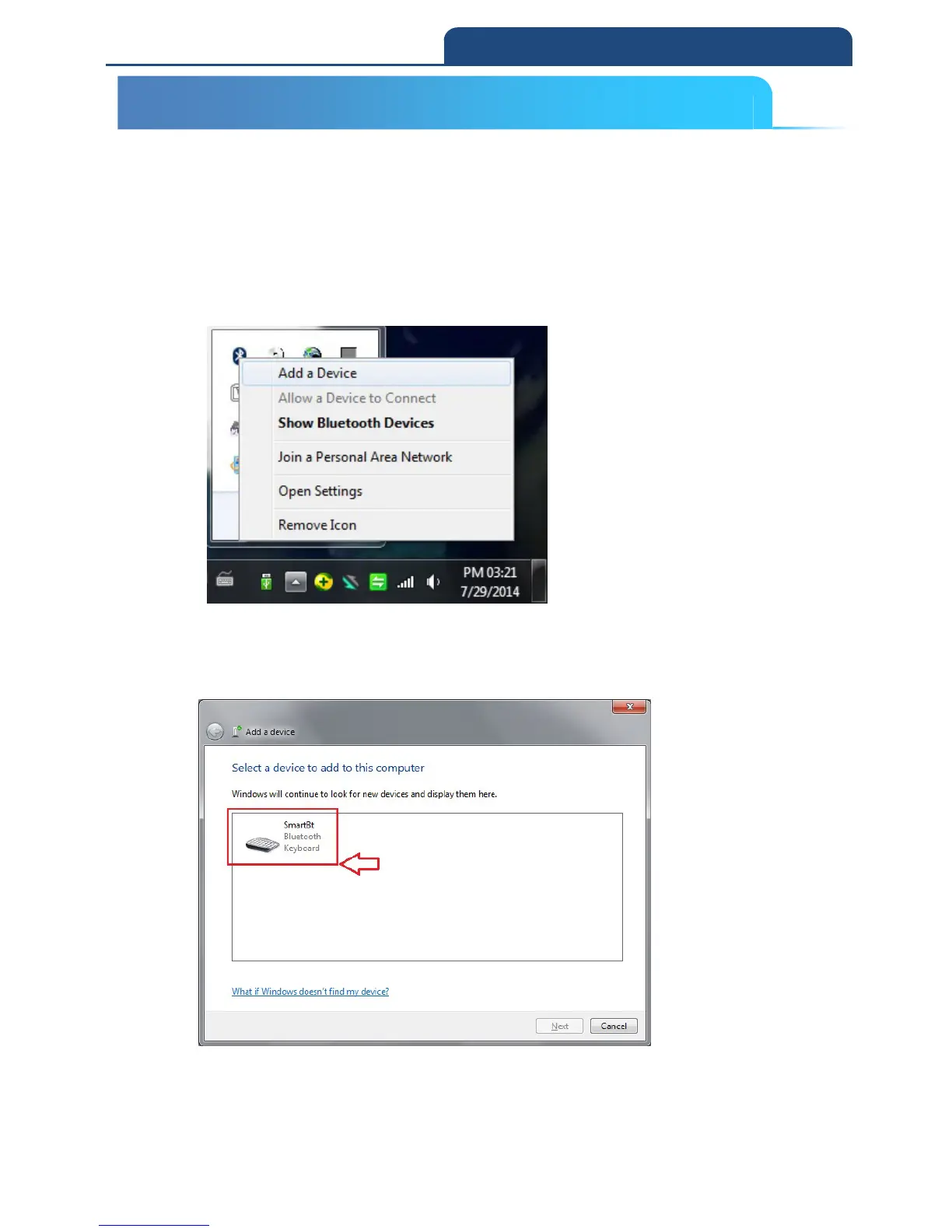 Select ”Add a Device”, it starts to search nearby available Bluetooth device. Make