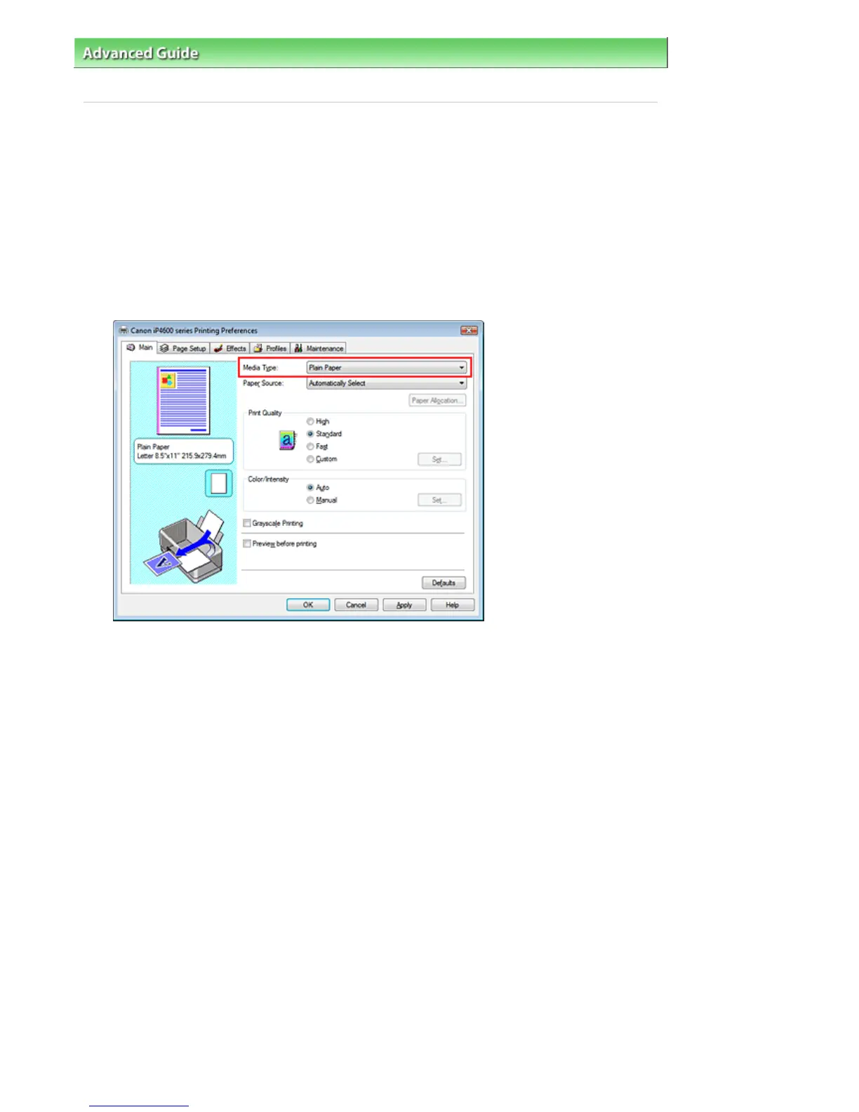 Select the type of paper loaded in the printer from the Media Type list on the Main tab.