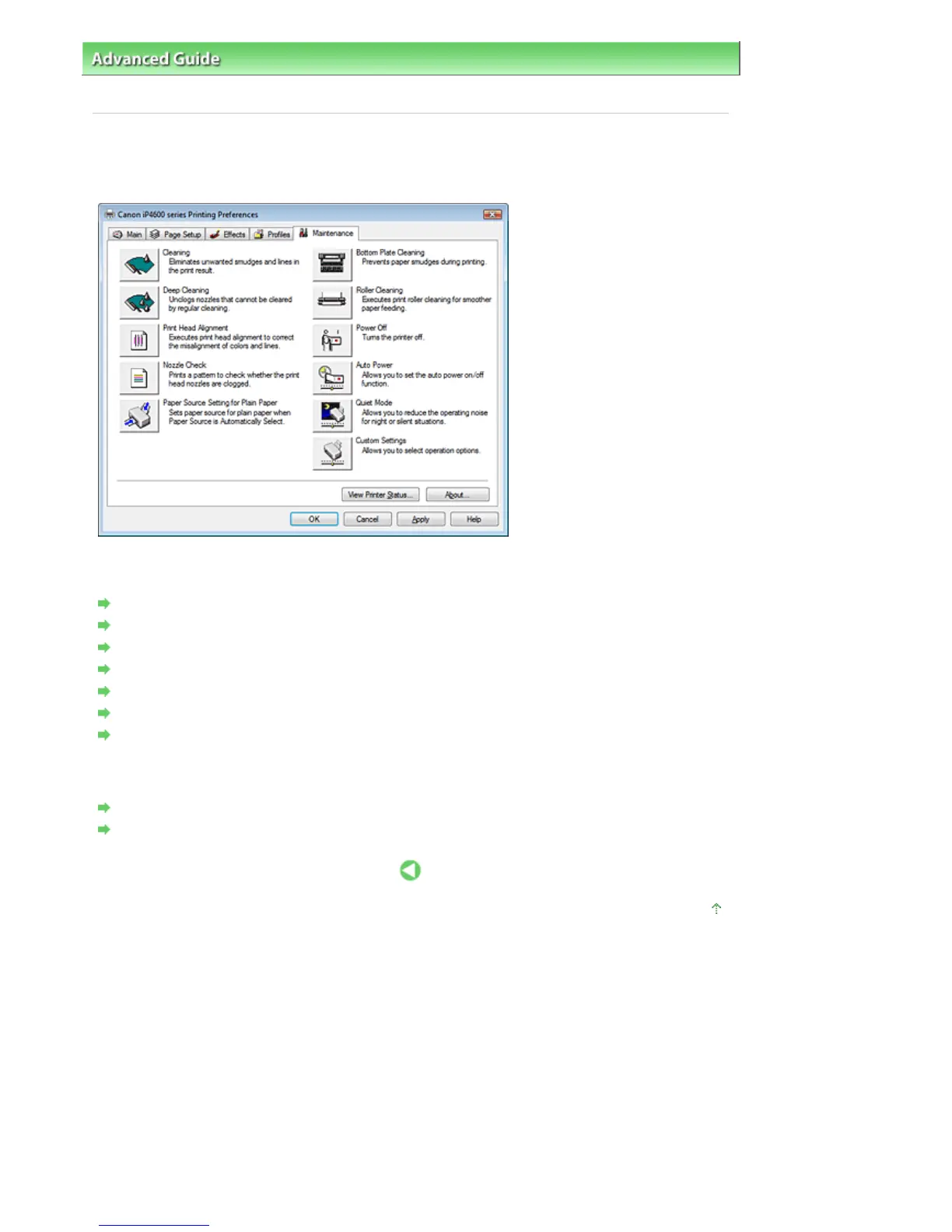 The Maintenance tab allows you to perform printer maintenance or change the settings of the printer.