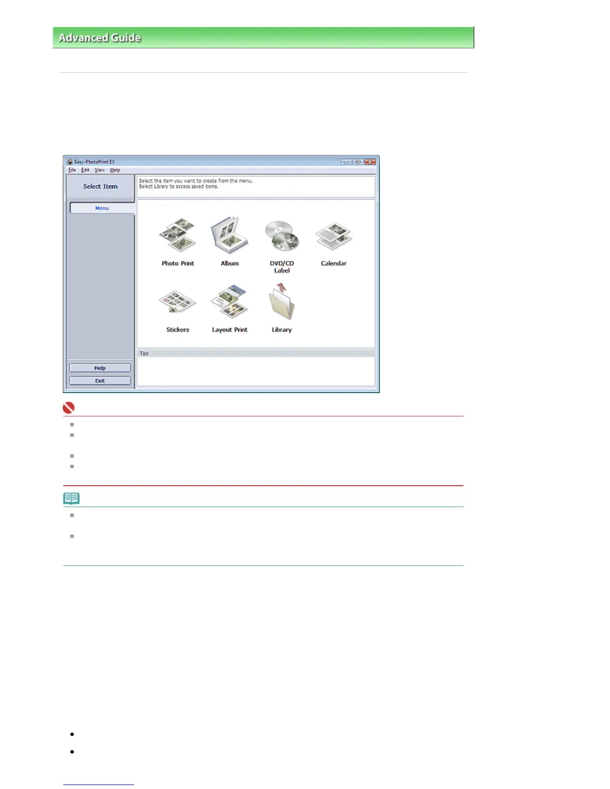 Click Help in a screen or dialog box, or select Easy-PhotoPrint EX Help from the Help menu. Help