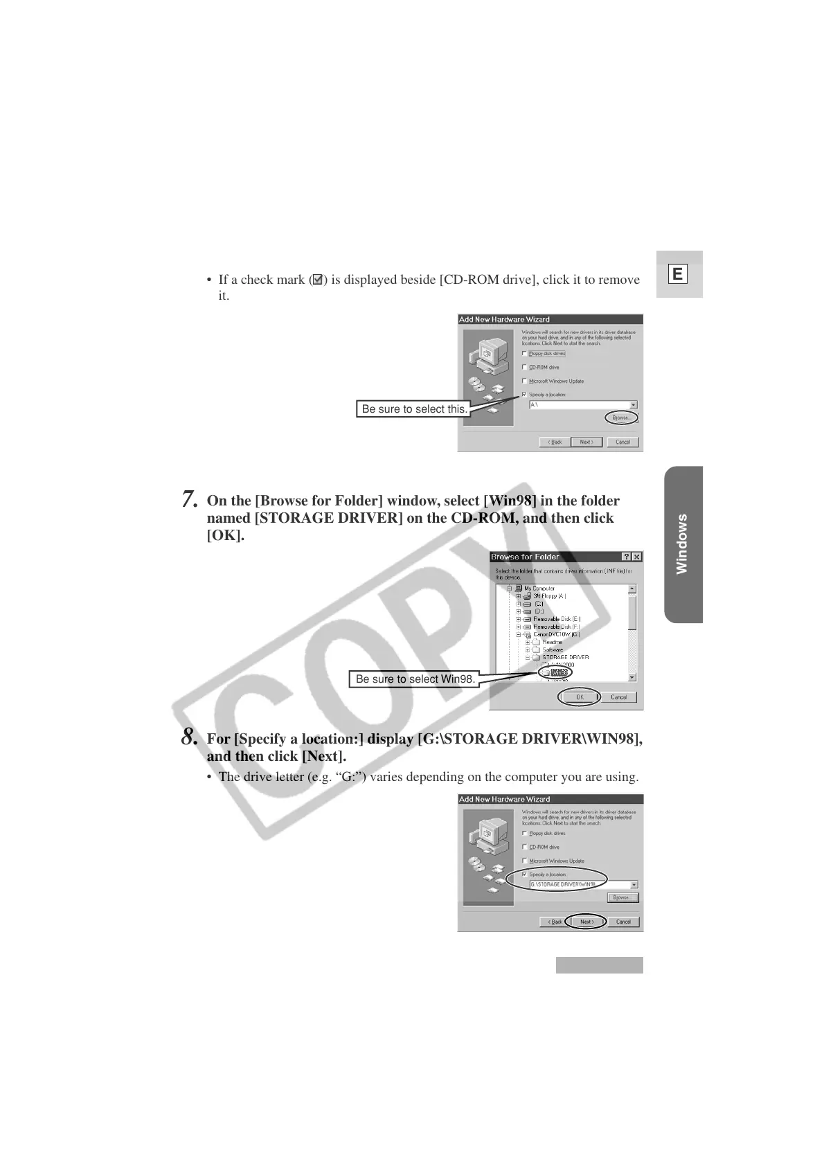 For [Specify a location:] display [G:\STORAGE DRIVER\WIN98],