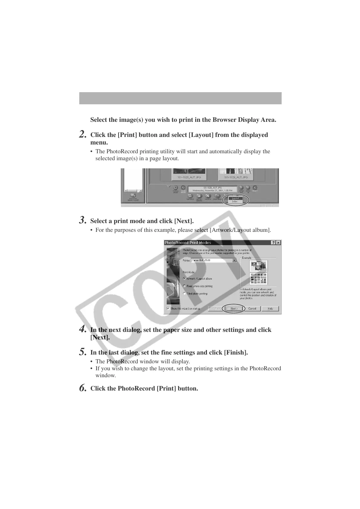 • If you wish to change the layout, set the printing settings in the PhotoRecord