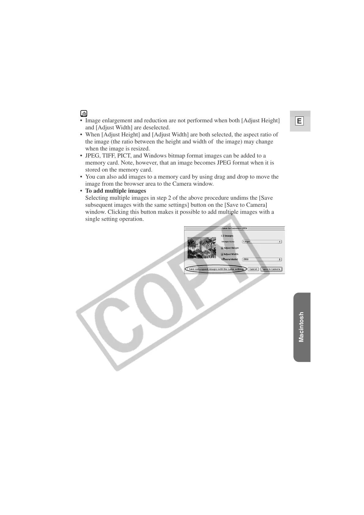 subsequent images with the same settings] button on the [Save to Camera]