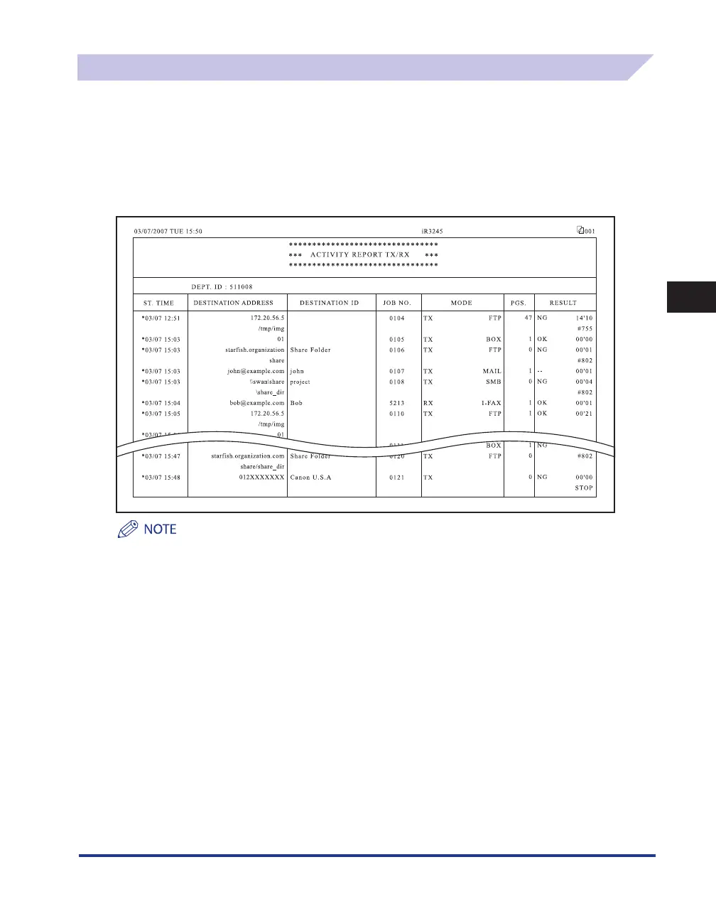 e-mail, I-fax, file server, and User Inbox transmission logs are also printed.