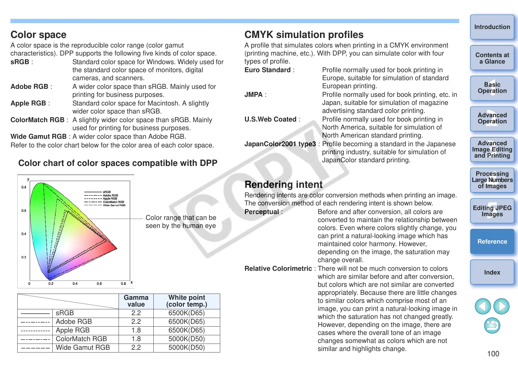Refer to the color chart below for the color area of each color space.