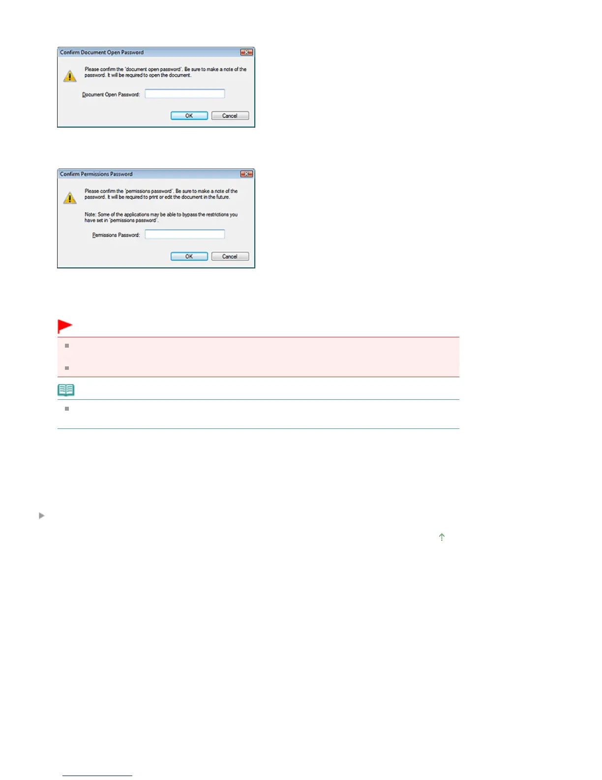 If you set the passwords via the PDF Settings dialog box, the PDF Settings dialog box returns.