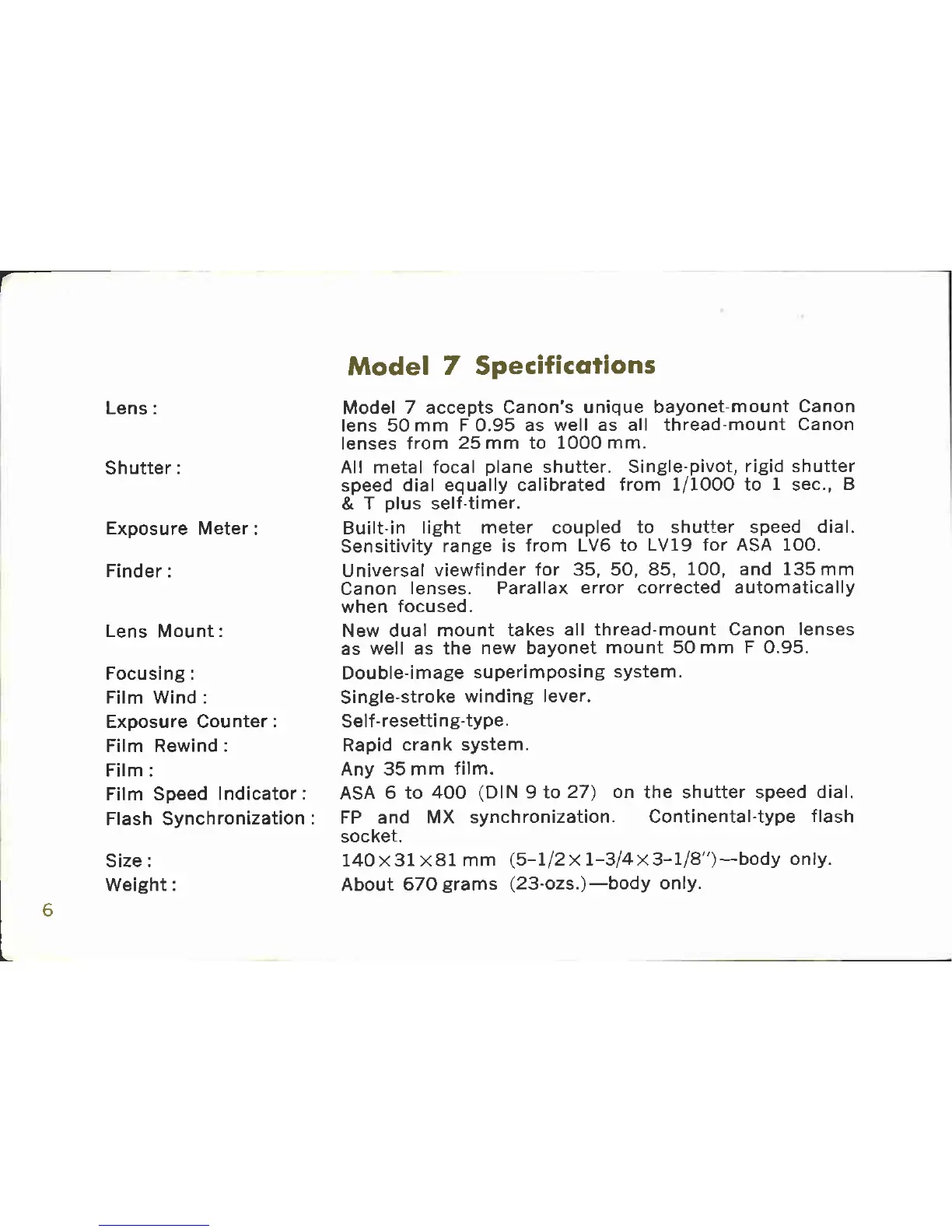 Canon 7 - Model 7 Specifications