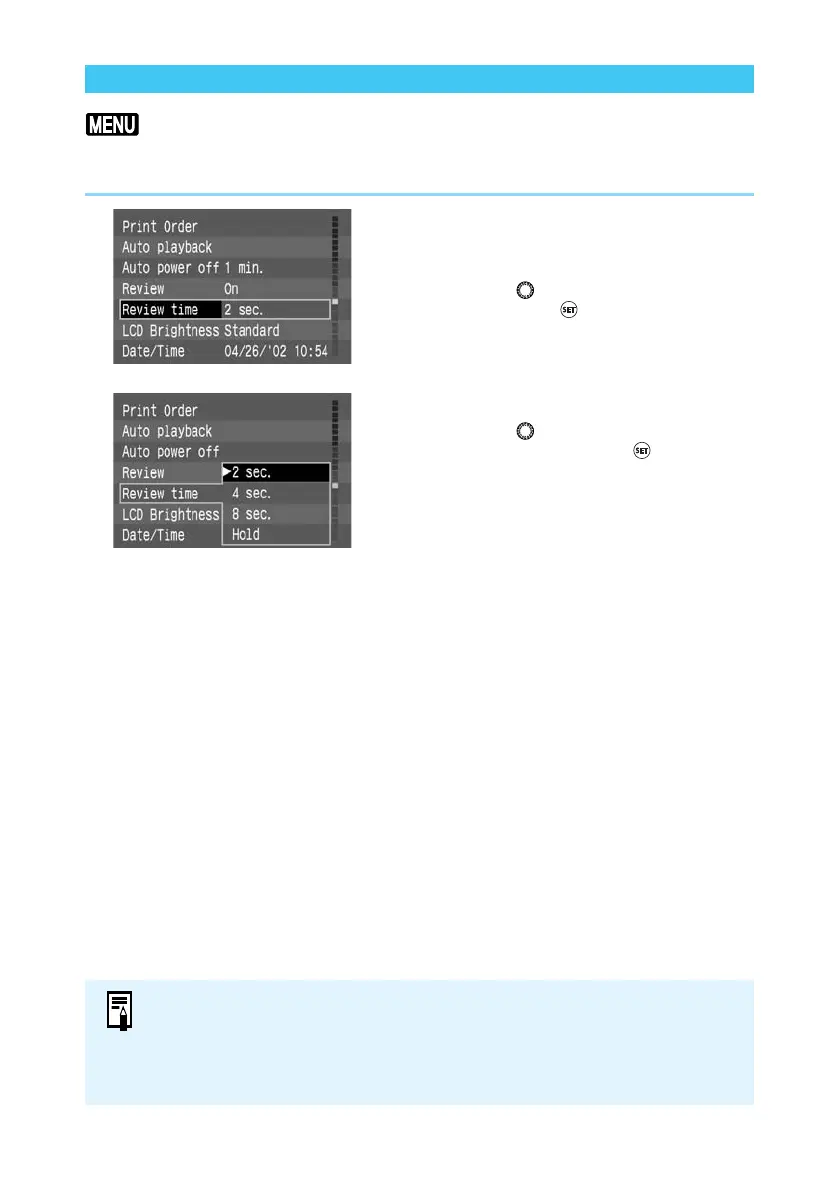 You can control how long images are displayed by setting the review time to [2 sec.], [4 sec.],