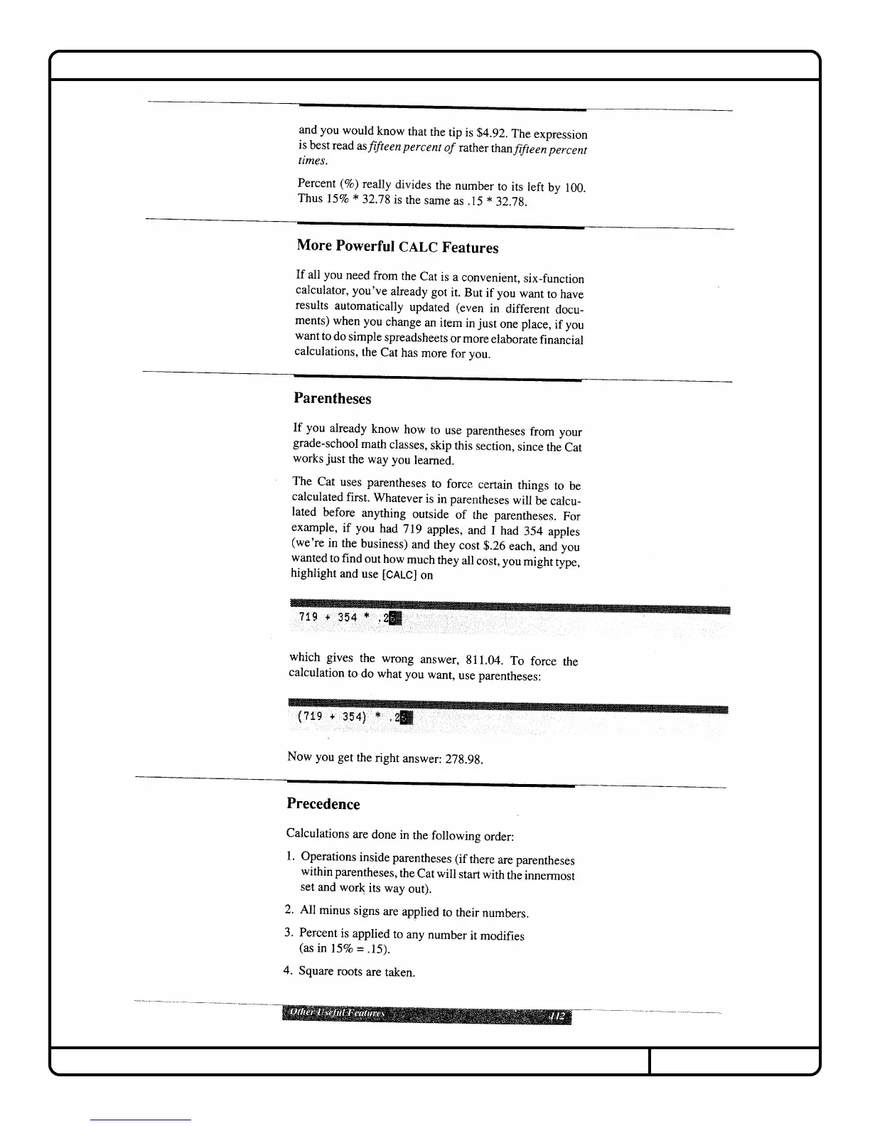 Canon Cat - Calculating With the Cat; Powerful CALC Functions; Using Parentheses in Calculations