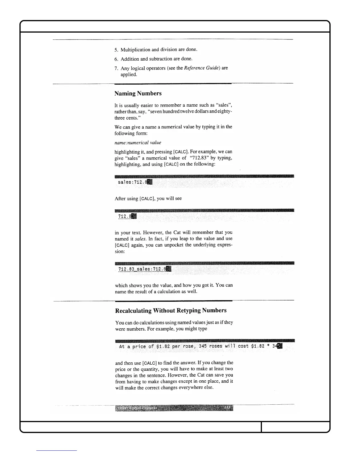 Canon Cat - Calculating With the Cat; Naming Numbers for Calculations; Recalculating Without Retyping
