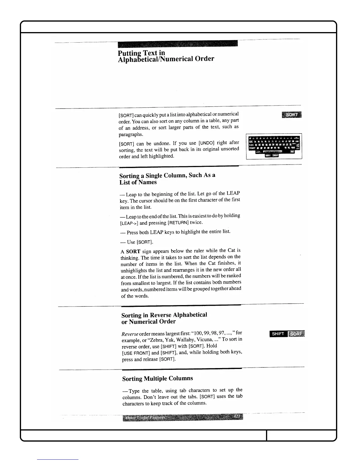 Canon Cat - Sorting Text Alphabetically and Numerically; Sorting Single Columns; Reverse and Numerical Sorting; Sorting Multiple Columns