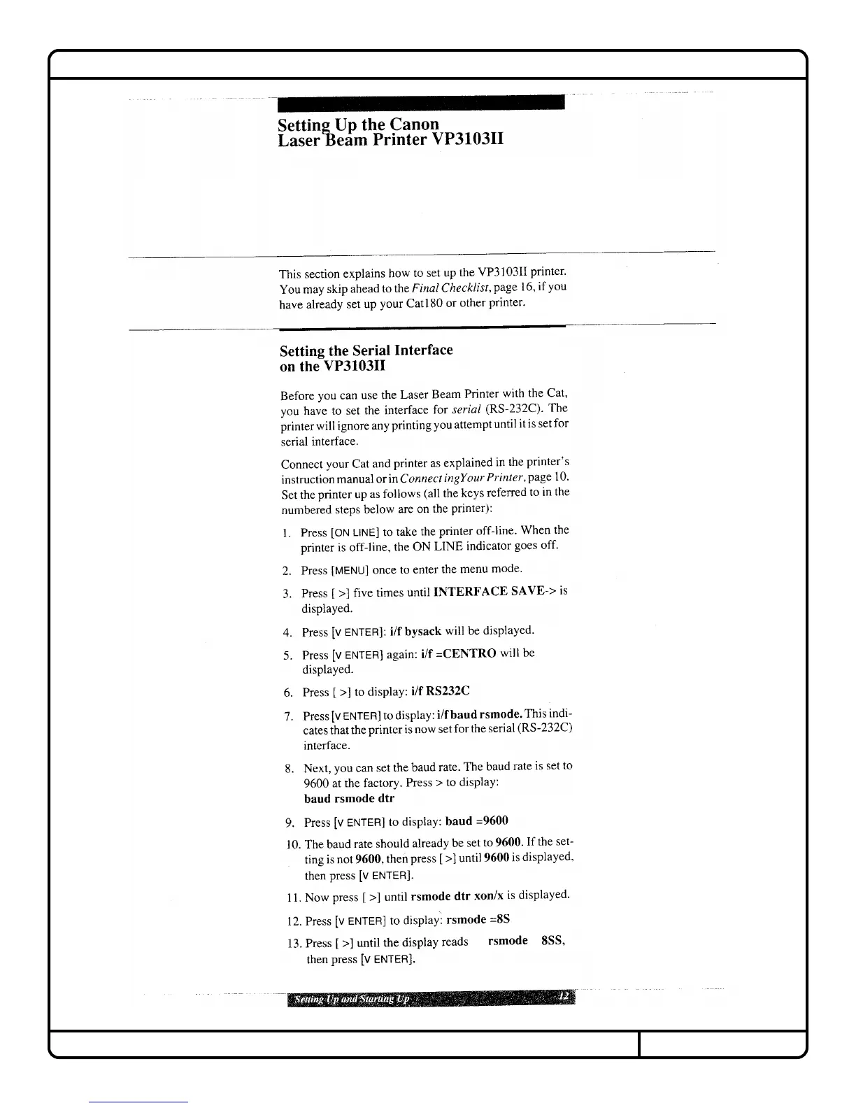 Canon Cat - Setting Up the Canon Laser Beam Printer VP3103 H; Setting the Serial Interface