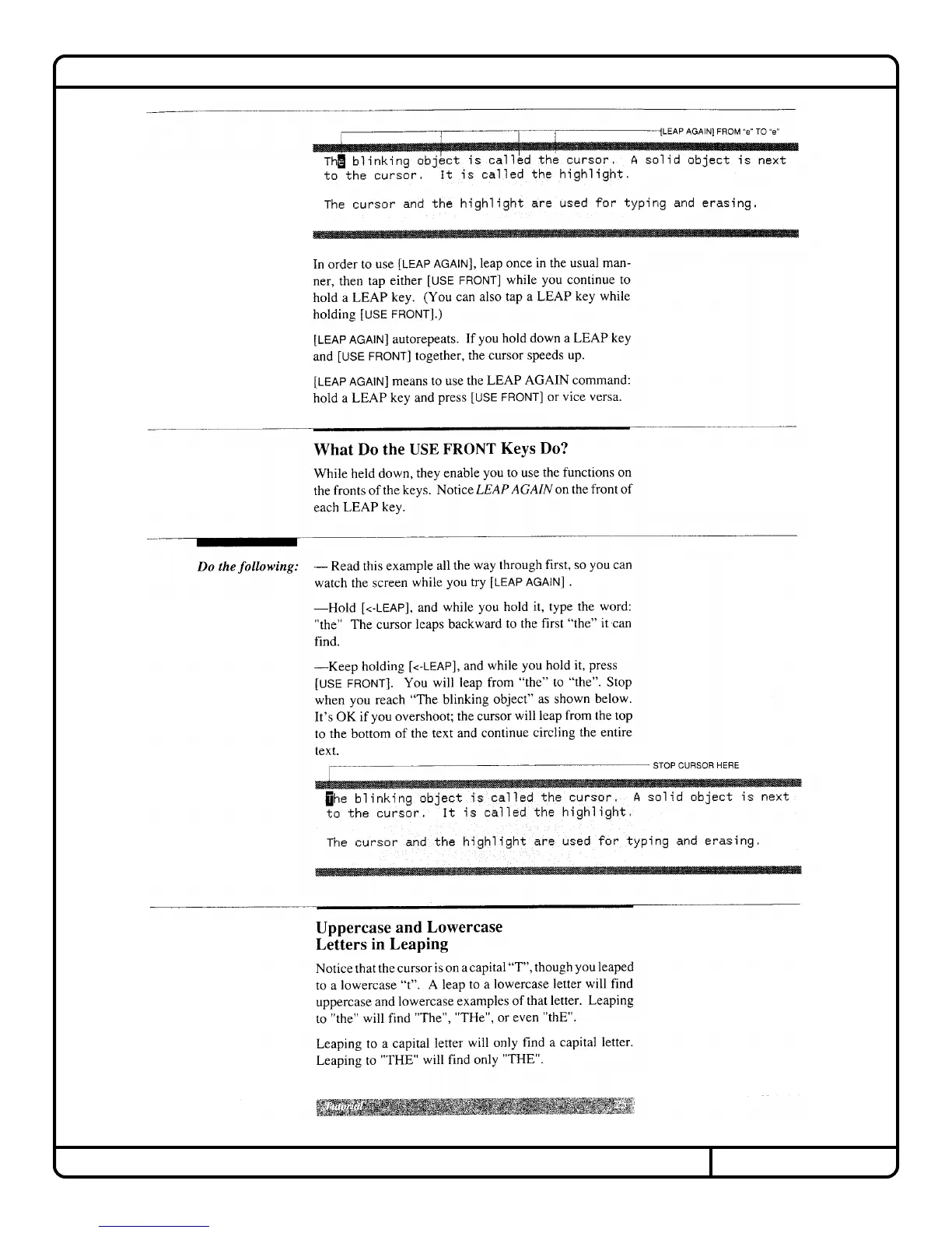 Canon Cat - Leaping: Navigating Text; Using the USE FRONT Keys; Case Sensitivity in Leaping