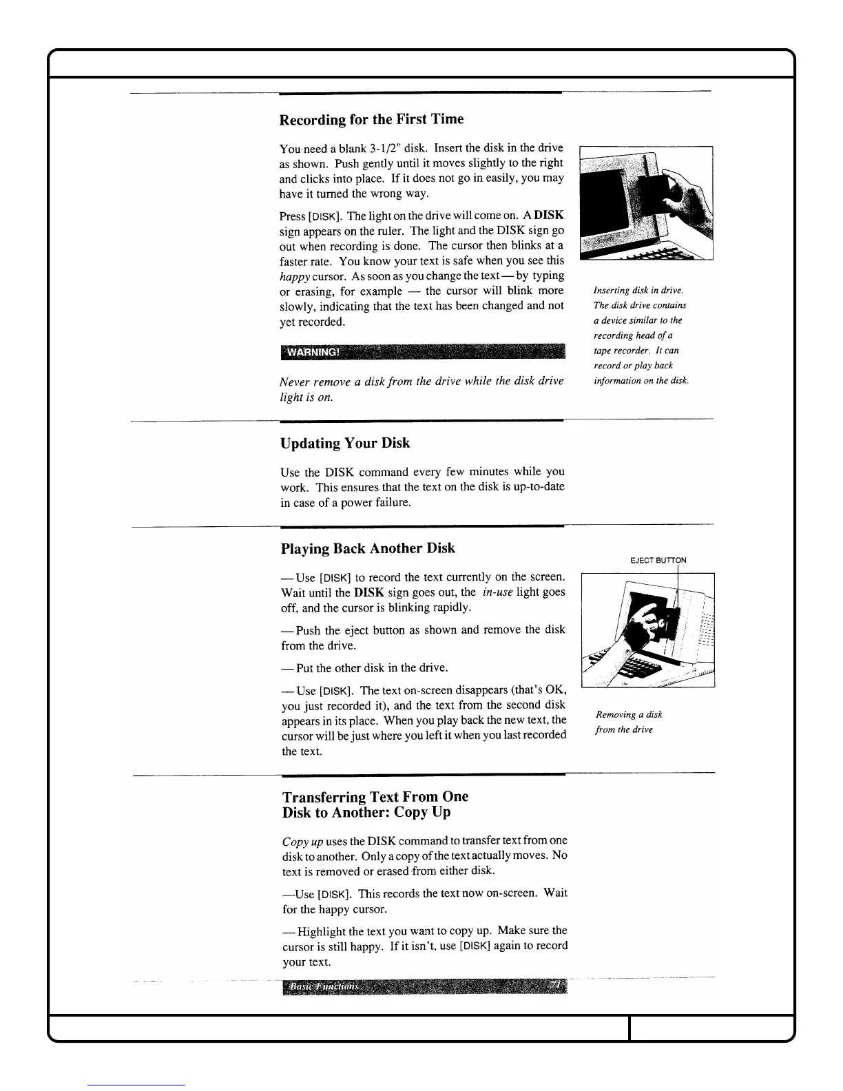 Canon Cat - Disk Drive Operations; Recording and Updating Disks; Playing Back Disks