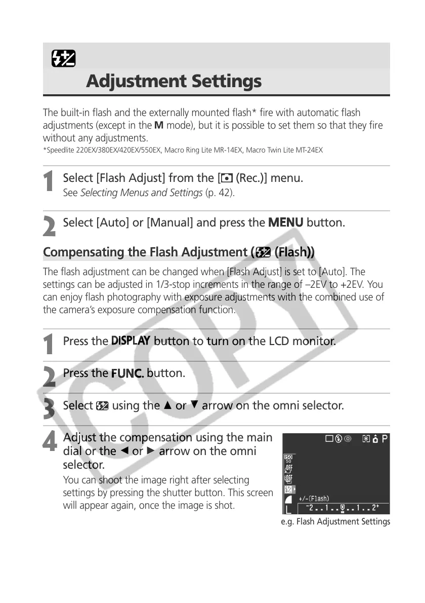 The flash adjustment can be changed when [Flash Adjust] is set to [Auto]. The