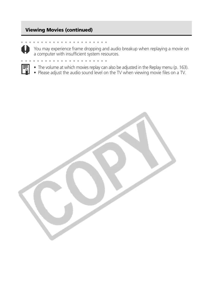The volume at which movies replay can also be adjusted in the Replay menu (p. 163).