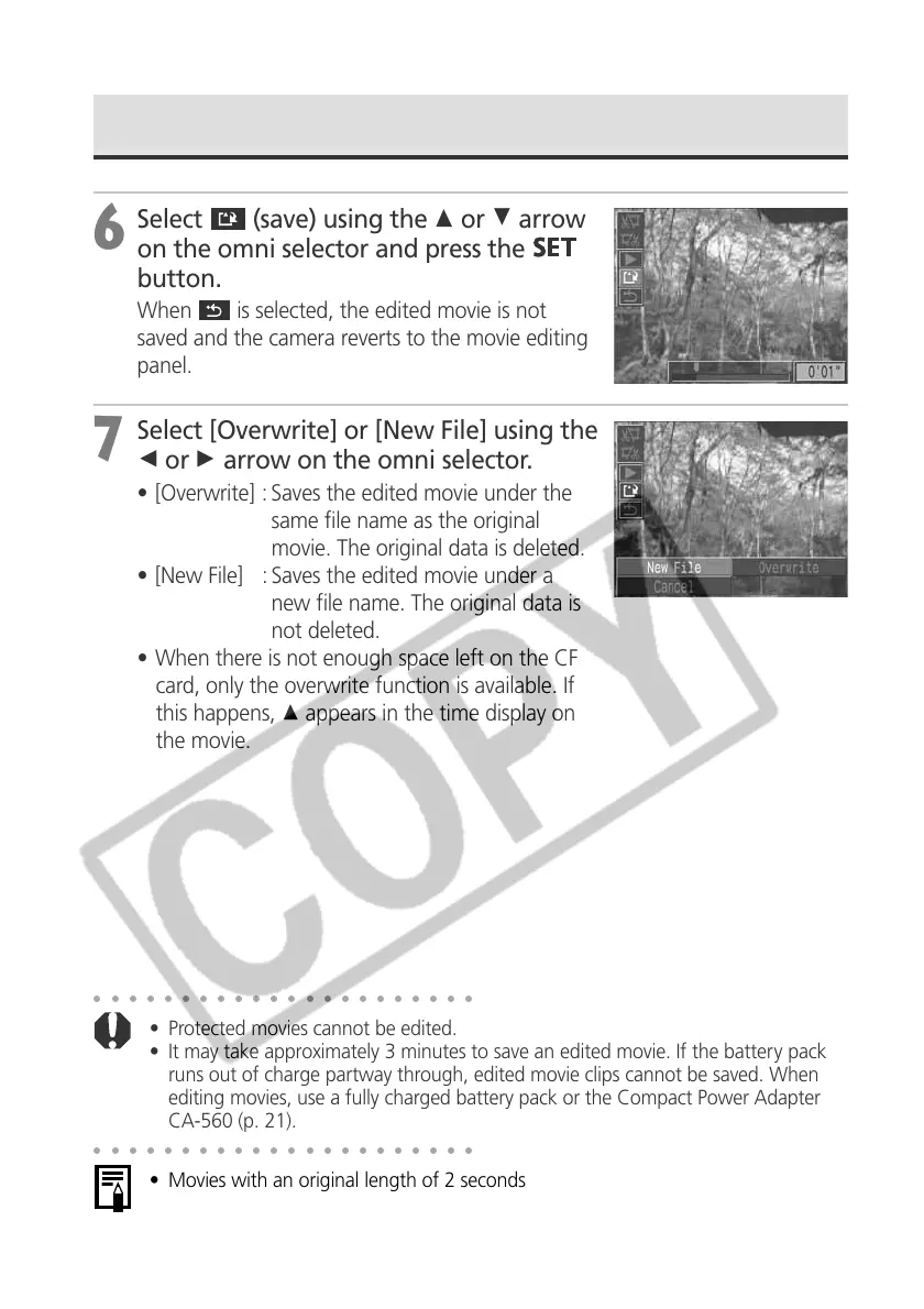 runs out of charge partway through, edited movie clips cannot be saved. When