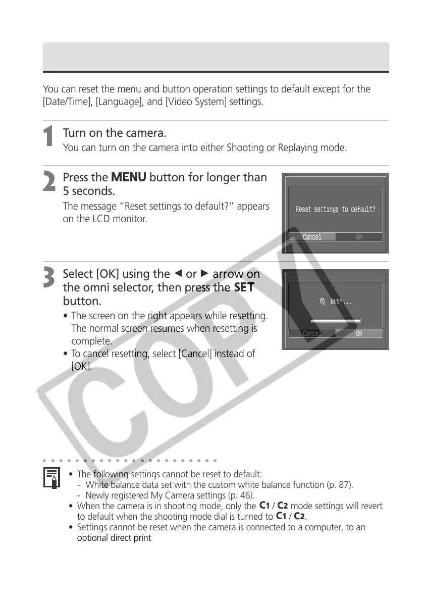 • Settings cannot be reset when the camera is connected to a computer, to an
