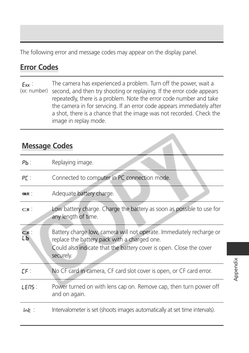 The following error and message codes may appear on the display panel.